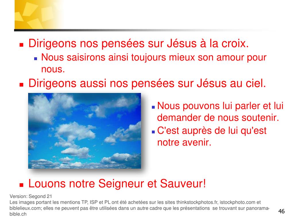 Dirigeons nos pensées sur Jésus à la croix. • Nous saisirons ainsi toujours mieux son amour pour nous. • Dirigeons aussi nos pensées sur Jésus au ciel. • Nous pouvons lui parler et lui demander de nous soutenir. • C'est auprès de lui qu'est notre avenir. • Louons notre Seigneur et Sauveur! Version: Segond 21 Les images portant les mentions TP, ISP et PL ont été achetées sur les sites thinkstockphotos.fr, istockphoto.com et biblelieux.com; elles ne peuvent pas être utilisées dans un autre cadre que les présentations se trouvant sur panorama-bible.ch