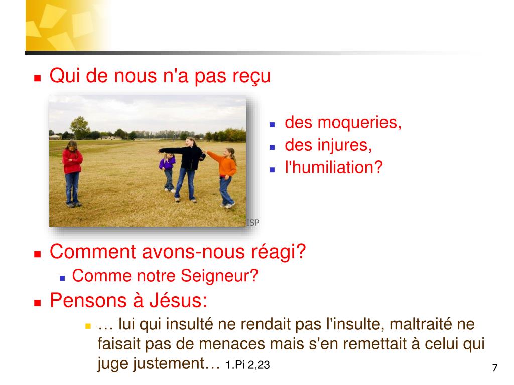 Qui de nous n'a pas reçu • des moqueries, • des injures, • l'humiliation? • Comment avons-nous réagi? • Comme notre Seigneur? • Pensons à Jésus: • … lui qui insulté ne rendait pas l'insulte, maltraité ne faisait pas de menaces mais s'en remettait à celui qui juge justement… 1.Pi 2,23 ISP