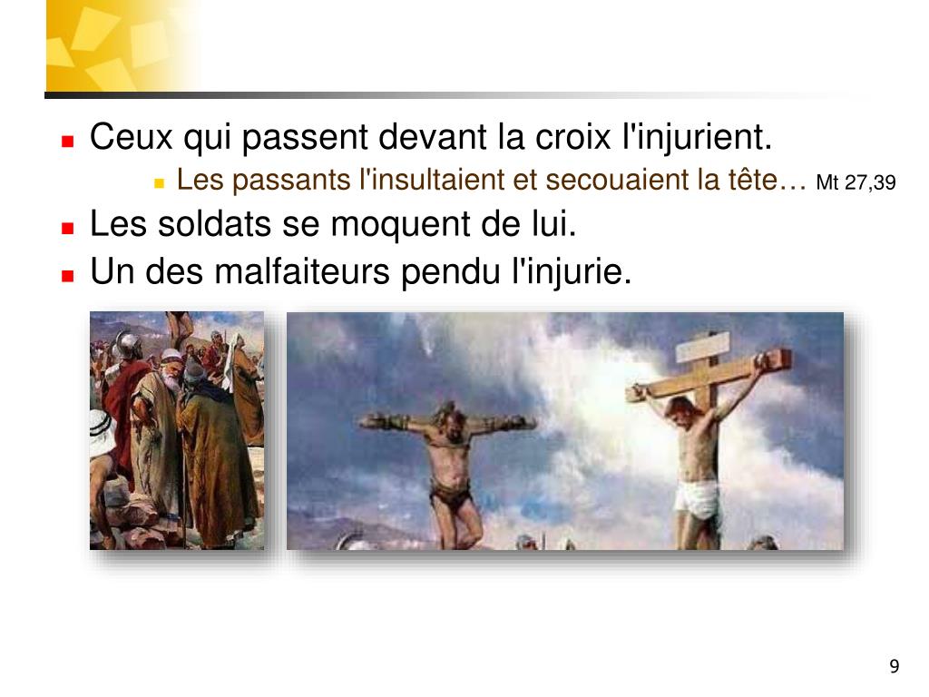 Ceux qui passent devant la croix l'injurient. • Les passants l'insultaient et secouaient la tête… Mt 27,39 • Les soldats se moquent de lui. • Un des malfaiteurs pendu l'injurie.