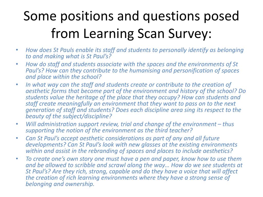 Some positions and questions posed from Learning Scan Survey: • How does St Pauls enable its staff and students to personally identify as belonging to and making what is St Paul’s? • How do staff and students associate with the spaces and the environments of St Paul’s? How can they contribute to the humanising and personification of spaces and place within the school? • In what way can the staff and students create or contribute to the creation of aesthetic forms that become part of the environment and history of the school? Do students value the heritage of the place that they occupy? How can students and staff create meaningfully an environment that they want to pass on to the next generation of staff and students? Does each discipline area sing its respect to the beauty of the subject/discipline? • Will administration support review, trial and change of the environment – thus supporting the notion of the environment as the third teacher? • Can St Paul’s accept aesthetic considerations as part of any and all future developments? Can St Paul’s look with new glasses at the existing environments within and assist in the rebranding of spaces and places to include aesthetics? • To create one’s own story one must have a pen and paper, know how to use them and be allowed to scribble and scrawl along the way… How do we see students at St Paul’s? Are they rich, strong, capable and do they have a voice that will affect the creation of rich learning environments where they have a strong sense of belonging and ownership.