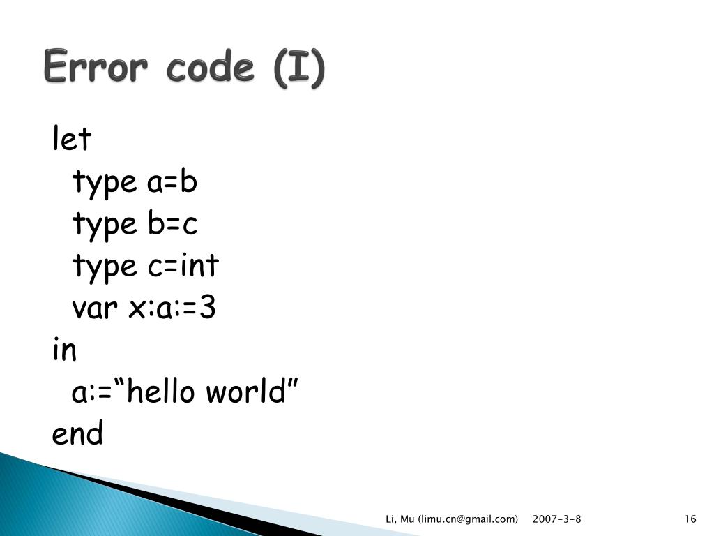 Error code (I) let type a=b type b=c type c=int var x:a:=3 in a:=“hello world” end Li, Mu (limu.cn@gmail.com)