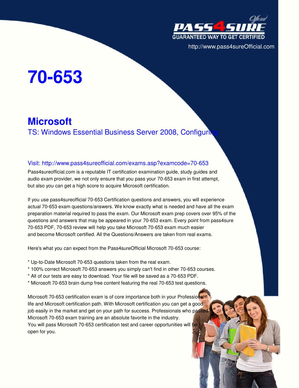 http://www.pass4sureOfficial.com 70-653 Microsoft TS: Windows Essential Business Server 2008, Configuring Visit: http://www.pass4sureofficial.com/exams.asp?examcode=70-653 Pass4sureofficial.com is a reputable IT certification examination guide, study guides and audio exam provider, we not only ensure that you pass your 70-653 exam in first attempt, but also you can get a high score to acquire Microsoft certification. If you use pass4sureofficial 70-653 Certification questions and answers, you will experience actual 70-653 exam questions/answers. We know exactly what is needed and have all the exam preparation material required to pass the exam. Our Microsoft exam prep covers over 95% of the questions and answers that may be appeared in your 70-653 exam. Every point from pass4sure 70-653 PDF, 70-653 review will help you take Microsoft 70-653 exam much easier and become Microsoft certified. All the Questions/Answers are taken from real exams. Here's what you can expect from the Pass4sureOfficial Microsoft 70-653 course: * Up-to-Date Microsoft 70-653 questions taken from the real exam. * 100% correct Microsoft 70-653 answers you simply can't find in other 70-653 courses. * All of our tests are easy to download. Your file will be saved as a 70-653 PDF. * Microsoft 70-653 brain dump free content featuring the real 70-653 test questions. Microsoft 70-653 certification exam is of core importance both in your Professional life and Microsoft certification path. With Microsoft certification you can get a good job easily in the market and get on your path for success. Professionals who passed Microsoft 70-653 exam training are an absolute favorite in the industry. You will pass Microsoft 70-653 certification test and career opportunities will be open for you.