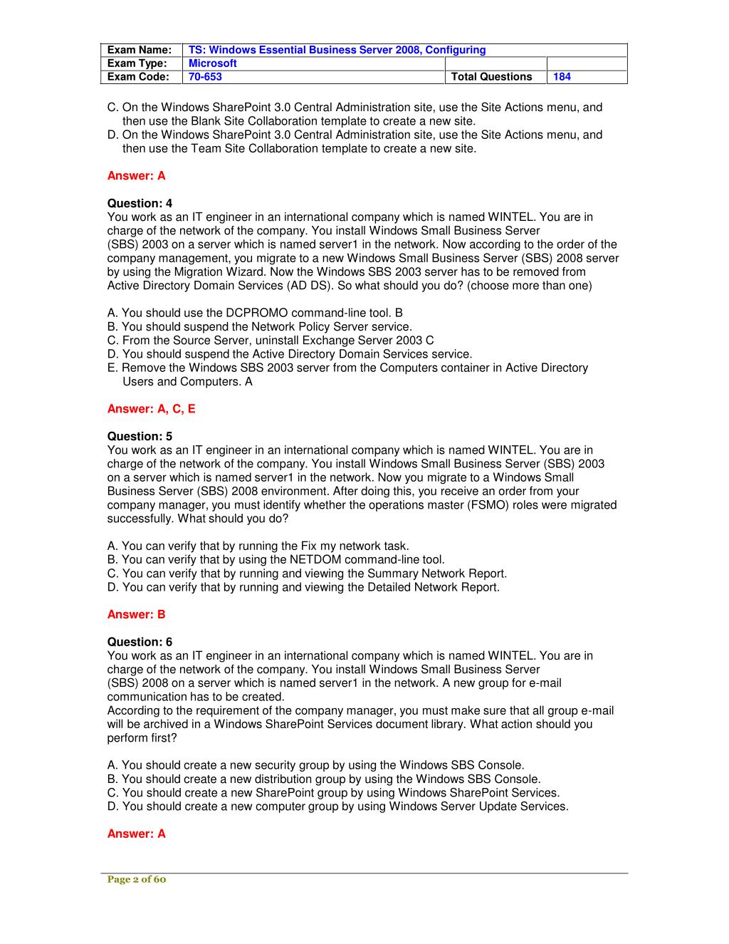 Exam Name: TS: Windows Essential Business Server 2008, Configuring Exam Type: Microsoft Exam Code: 70-653 Total Questions 184 Question: 1 You work as an IT engineer in an international company which is named WINTEL. You are in charge of the network of the company. You install Windows Small Business Server (SBS) 2008 on a sever which is named server1 in your network. You have Remote Web Workplace installed. Now you are assigned a task to not allow a user named Linc to access Remote Web Workplace. What are two possible ways to accomplish this task? (Each correct answer presents a complete solution. Choose more than one.) A. The way of using the Windows SBS Console to remove Lincs user account from the Windows SBS Remote Web Workplace Users security group. B. The way of using the Windows SBS Console to modify Lincs user account properties. C. The way of using the Windows SBS Console to modify the Standard User role properties. D. The way of using Active Directory Users and Computers to modify Lincs user account properties. E. The way of using Active Directory Users and Computers to remove Lincs user account from the Windows SBS Remote Web Workplace Users security group. F. The way of using Active Directory Users and Computers to remove Lincs user account from the Windows SBS Link Users security group. Answer: B, E Question: 2 You work as an IT engineer in an international company which is named WINTEL. You are in charge of the network of the company. You have a Windows Small Business Server (SBS) 2003 environment installed on a server named server1 in the network. Now you use the Migration Wizard to upgrade the (SBS) 2003 environment to a Windows Small Business Server (SBS) 2008 environment to meet the business requirements. In order to have the Windows SBS 2003 server removed from Active Directory Domain Services (ADDS), which three options should you choose? (Each correct answer presents part of the solution. Select three.) A. You should stop the Network Policy Server service to remove the Windows SBS 2003 server from Active Directory Domain Services (AD DS). B. You should uninstall Exchange Server 2003 from the Source Server to remove the Windows SBS 2003 server from Active Directory Domain Services (AD DS). C. You should use the DCPROMO command-line tool to remove the Windows SBS 2003 server from Active Directory Domain Services (AD DS). D. You should stop the Active Directory Domain Services service to remove the Windows SBS 2003 server from Active Directory Domain Services (AD DS). E. You should have the Windows SBS 2003 server deleted from the Computers container in Active Directory Users and Computers. Answer: B, C, E Question: 3 You work as an IT engineer in an international company which is named WINTEL. You are in charge of the company network and you install Windows Small Business Server (SBS) 2008 on a sever which is named server1 in the network. Within the Internal Web site, you intend to deploy a new Windows SharePoint Services site. Before creating the new site, you should make sure that users in the sales department will create the layout and all content of the new site. Which action should you perform? A. On the Internal Web site, use the Site Actions menu, and then use the Blank Site Collaboration template to create a new site. B. On the Internal Web site, use the Site Actions menu, and then use Team Site Collaboration template to create a new site. Page 1 of 60
