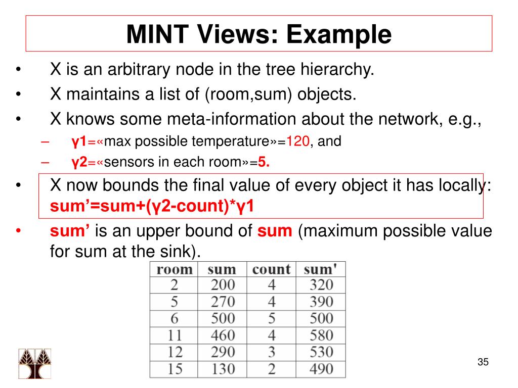 ΜΙΝΤ Views: Example • X is an arbitrary node in the tree hierarchy. • X maintains a list of (room,sum) objects. • X knows some meta-information about the network, e.g., • γ1=«maxpossible temperature»=120, and • γ2=«sensors in each room»=5. • X now bounds the final value of every object it has locally: sum’=sum+(γ2-count)*γ1 • sum’ is an upper bound of sum (maximum possible value for sum at the sink).