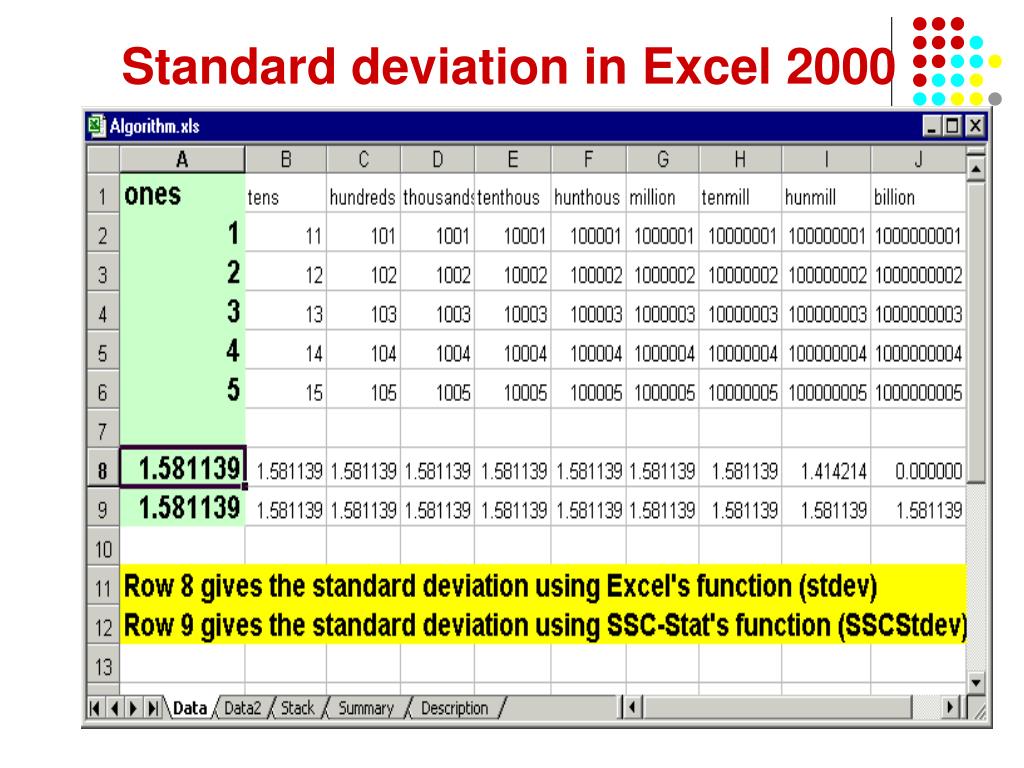 Another problem with Excel • Software should give the right answer • We show that Excel did not • though SSC-Stat is OK • Give the mean and standard deviation of: 1 2 3 4 5 mean = 3 s.d. = 1.58 • What is the mean and s.d. if we add 10? 11 12 13 14 15 mean = 13 s.d. = 1.58 again • Check you understand that this is true