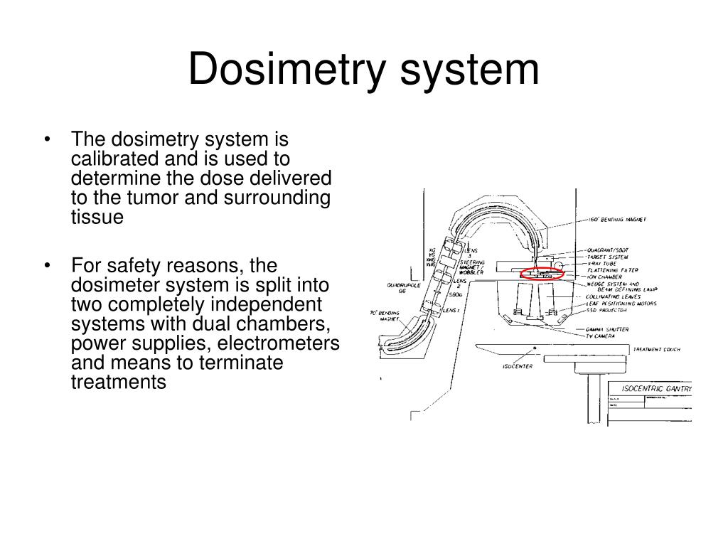 Dosimetry system • The dosimetry system is calibrated and is used to determine the dose delivered to the tumor and surrounding tissue • For safety reasons, the dosimeter system is split into two completely independent systems with dual chambers, power supplies, electrometers and means to terminate treatments
