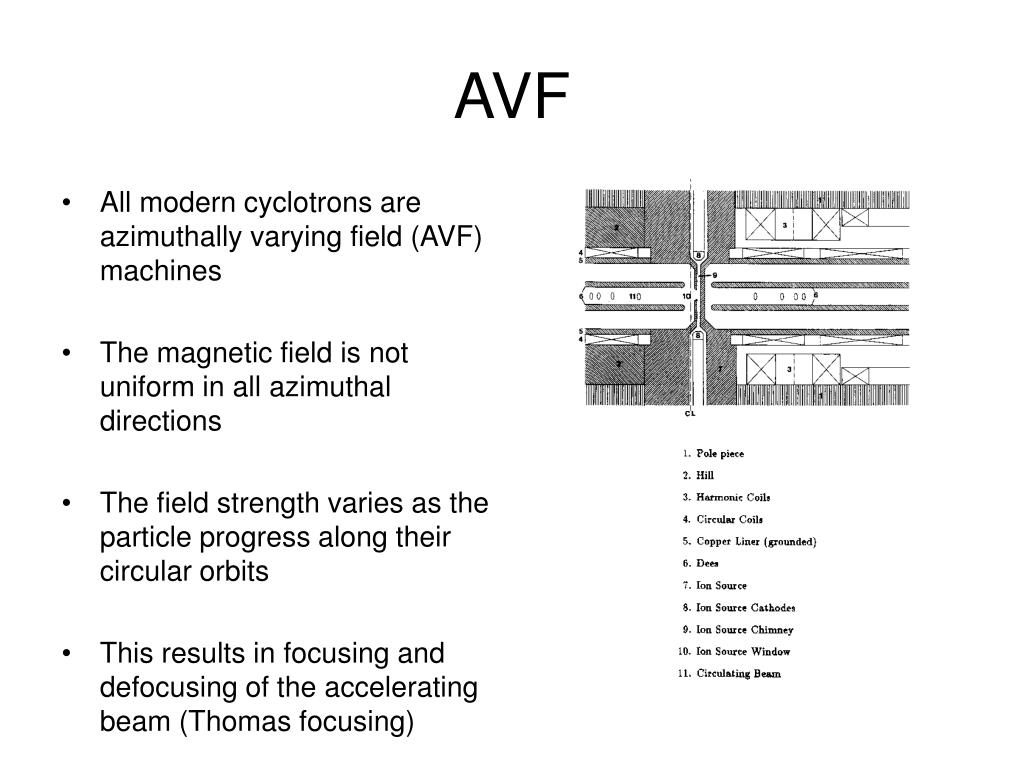 AVF • All modern cyclotrons are azimuthally varying field (AVF) machines • The magnetic field is not uniform in all azimuthal directions • The field strength varies as the particle progress along their circular orbits • This results in focusing and defocusing of the accelerating beam (Thomas focusing)