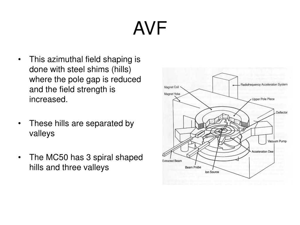 AVF • This azimuthal field shaping is done with steel shims (hills) where the pole gap is reduced and the field strength is increased. • These hills are separated by valleys • The MC50 has 3 spiral shaped hills and three valleys
