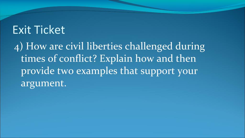 Exit Ticket • 4) How are civil liberties challenged during times of conflict? Explain how and then provide two examples that support your argument.