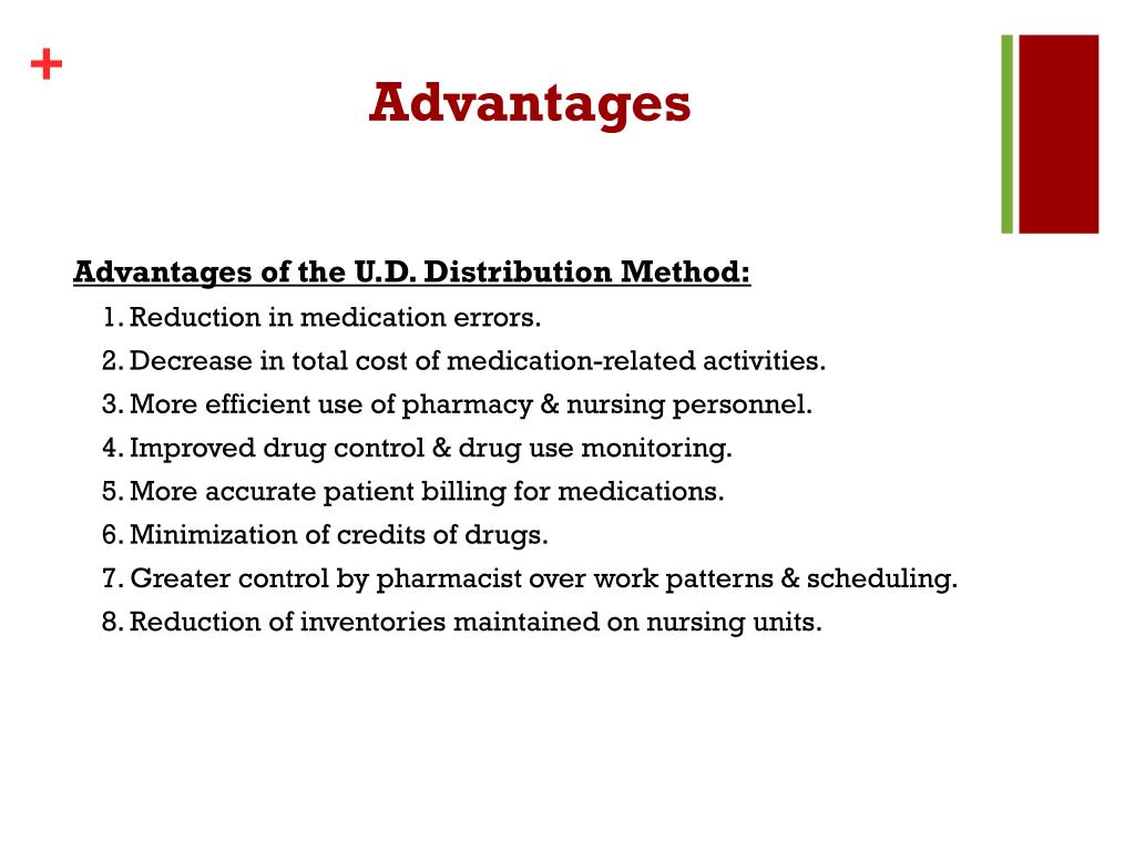 Advantages Advantages of the U.D. Distribution Method: 1. Reduction in medication errors. 2. Decrease in total cost of medication-related activities. 3. More efficient use of pharmacy & nursing personnel. 4. Improved drug control & drug use monitoring. 5. More accurate patient billing for medications. 6. Minimization of credits of drugs. 7. Greater control by pharmacist over work patterns & scheduling. 8. Reduction of inventories maintained on nursing units.