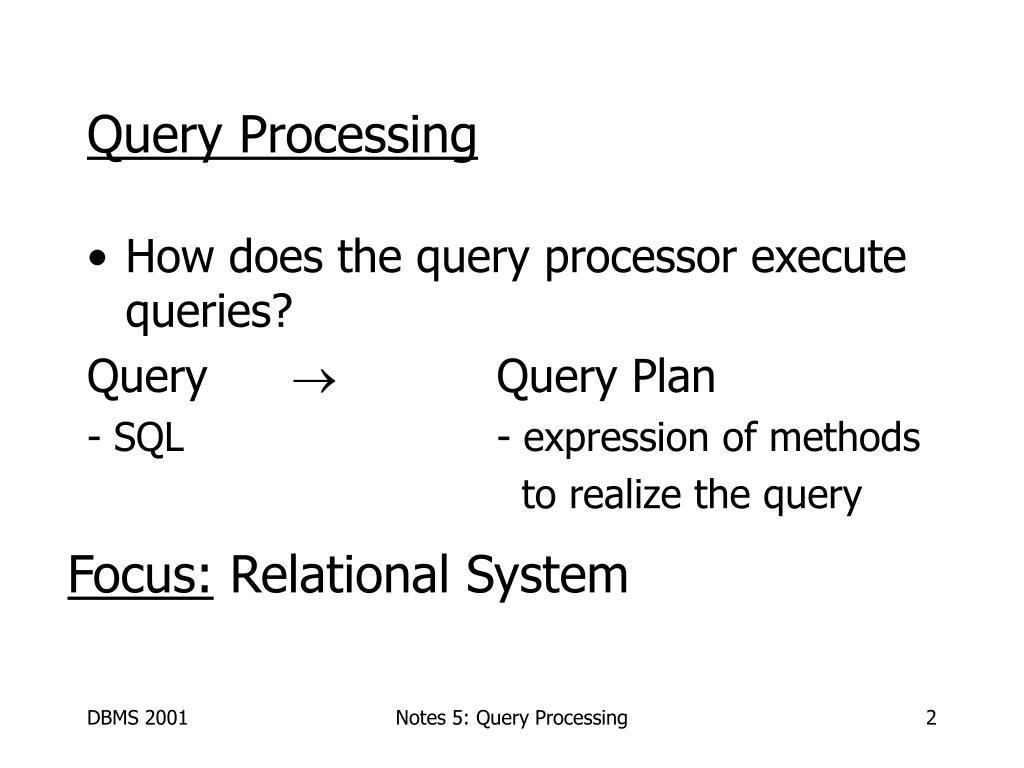 Focus: Relational System Query Processing • How does the query processor execute queries? Query Query Plan - SQL - expression of methods to realize the query Notes 5: Query Processing