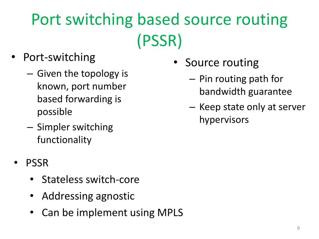 Port switching based source routing (PSSR) • Source routing • Pin routing path for bandwidth guarantee • Keep state only at server hypervisors • Port-switching • Given the topology is known, port number based forwarding is possible • Simpler switching functionality • PSSR • Stateless switch-core • Addressing agnostic • Can be implement using MPLS