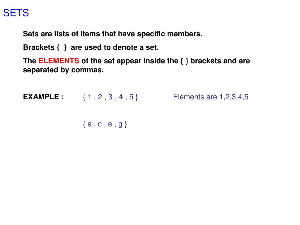 SETS Sets are lists of items that have specific members. Brackets { } are used to denote a set. The ELEMENTS of the set appear inside the { } brackets and are separated by commas. EXAMPLE : { 1 , 2 , 3 , 4 , 5 } Elements are 1,2,3,4,5 { a , c , e , g }