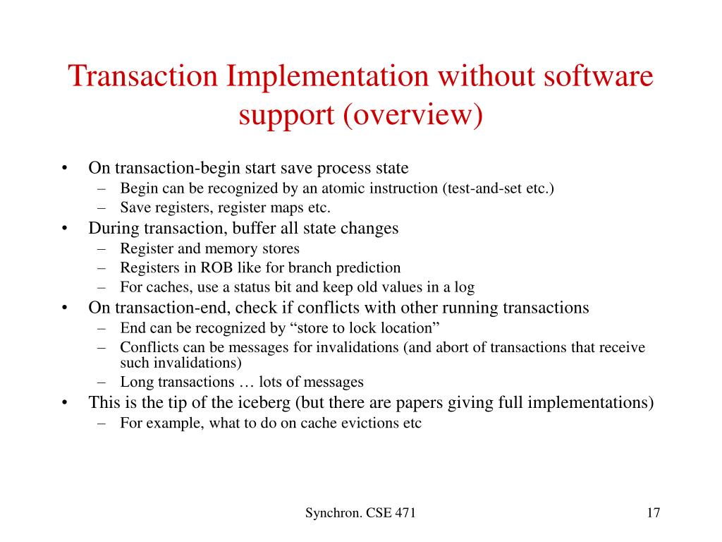 Transaction Implementation without software support (overview) • On transaction-begin start save process state • Begin can be recognized by an atomic instruction (test-and-set etc.) • Save registers, register maps etc. • During transaction, buffer all state changes • Register and memory stores • Registers in ROB like for branch prediction • For caches, use a status bit and keep old values in a log • On transaction-end, check if conflicts with other running transactions • End can be recognized by “store to lock location” • Conflicts can be messages for invalidations (and abort of transactions that receive such invalidations) • Long transactions … lots of messages • This is the tip of the iceberg (but there are papers giving full implementations) • For example, what to do on cache evictions etc Synchron. CSE 471