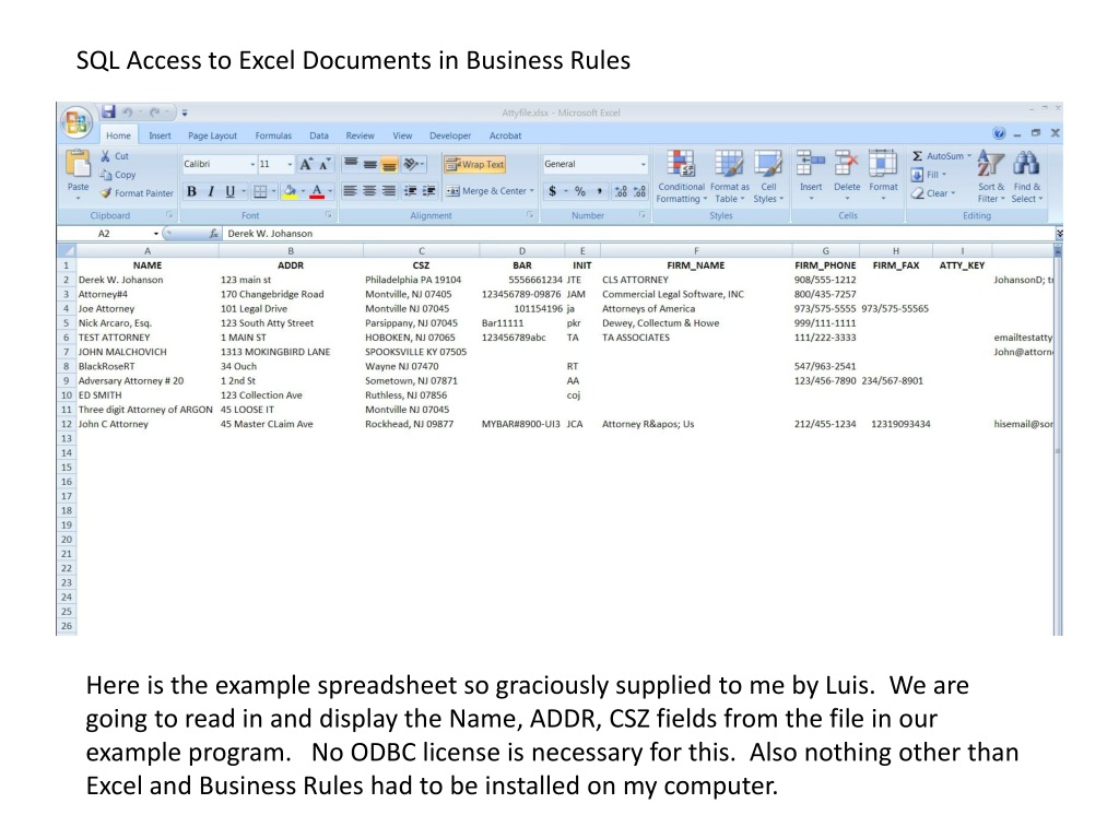 SQL Access to Excel Documents in Business Rules Here is the example spreadsheet so graciously supplied to me by Luis. We are going to read in and display the Name, ADDR, CSZ fields from the file in our example program. No ODBC license is necessary for this. Also nothing other than Excel and Business Rules had to be installed on my computer.