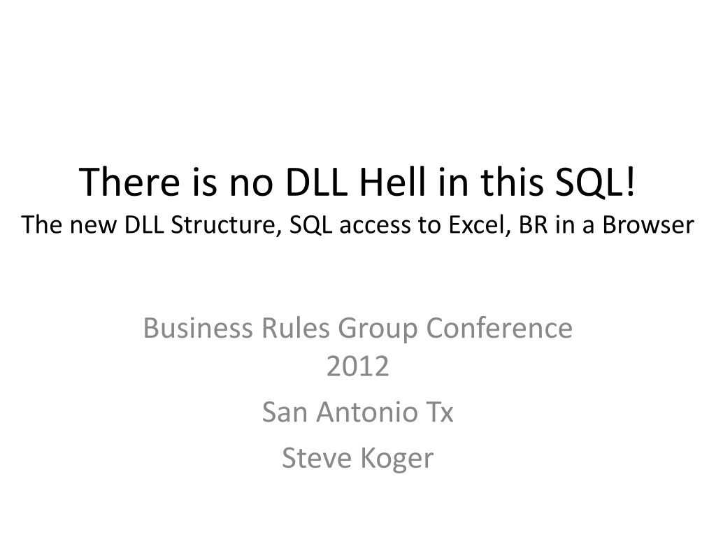 There is no DLL Hell in this SQL! The new DLL Structure, SQL access to Excel, BR in a Browser. Business Rules Group Conference 2012 San Antonio Tx Steve Koger. Getting the latest stuff.