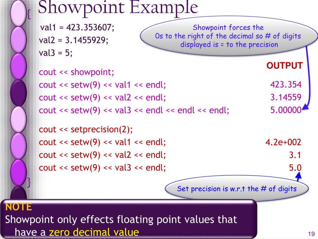 Fixed Example { float val1; float val2; float val3; val1 = 423.353607; val2 = 3.1455929; val3 = 5; cout << setw(12) << val1 << endl; cout << setw(12) << val2 << endl; cout << setw(12) << val3 << endl << endl << endl; cout << fixed; cout << setw(12) << val1 << endl; cout << setw(12) << val2 << endl cout << setw(12) << val3 << endl; } It rounds default precision is set to 6 OUTPUT 423.354 3.14559 5 423.353607 3.145593 5.000000 With fixed it forces 0s to the current precision Note there are 6 0s