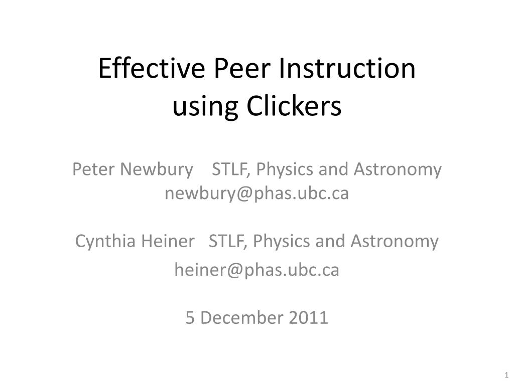 Effective Peer Instructionusing Clickers Peter Newbury STLF, Physics and Astronomynewbury@phas.ubc.caCynthia Heiner STLF, Physics and Astronomy heiner@phas.ubc.ca5 December 2011