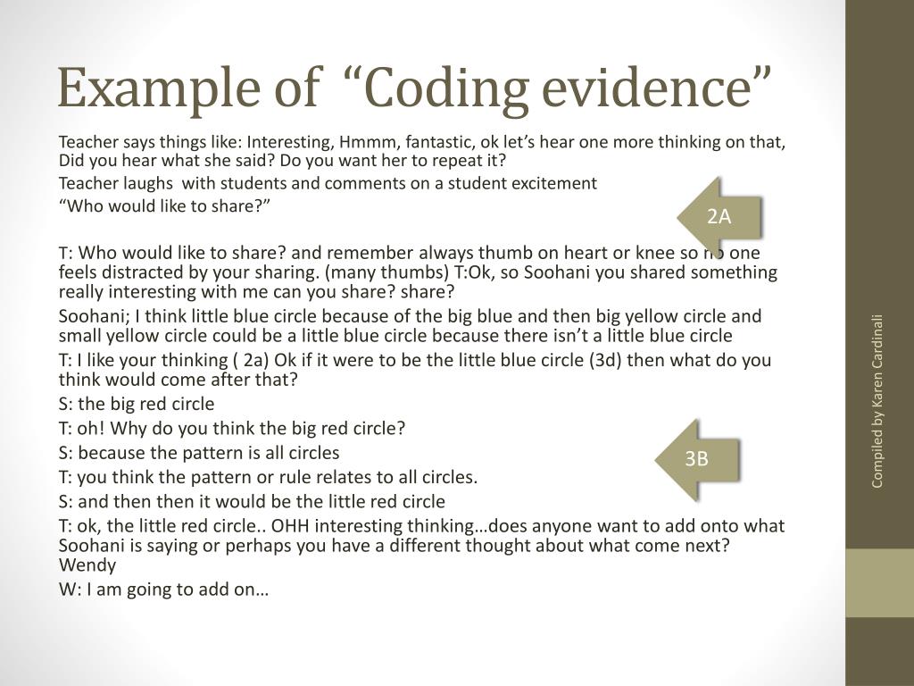 Example of “Coding evidence” Teacher says things like: Interesting, Hmmm, fantastic, ok let’s hear one more thinking on that, Did you hear what she said? Do you want her to repeat it? Teacher laughs with students and comments on a student excitement “Who would like to share?” T: Who would like to share? and remember always thumb on heart or knee so no one feels distracted by your sharing. (many thumbs) T:Ok, so Soohaniyou shared something really interesting with me can you share? share? Soohani; I think little blue circle because of the big blue and then big yellow circle and small yellow circle could be a little blue circle because there isn’t a little blue circle T: I like your thinking ( 2a) Ok if it were to be the little blue circle (3d) then what do you think would come after that? S: the big red circle T: oh! Why do you think the big red circle? S: because the pattern is all circles T: you think the pattern or rule relates to all circles. S: and then then it would be the little red circle T: ok, the little red circle.. OHH interesting thinking…does anyone want to add onto what Soohani is saying or perhaps you have a different thought about what come next? Wendy W: I am going to add on… 2A Compiled by Karen Cardinali 3B