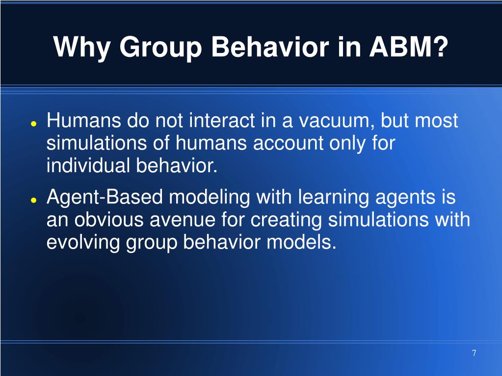 Why Group Behavior in ABM? • Humans do not interact in a vacuum, but most simulations of humans account only for individual behavior. • Agent-Based modeling with learning agents is an obvious avenue for creating simulations with evolving group behavior models. 7