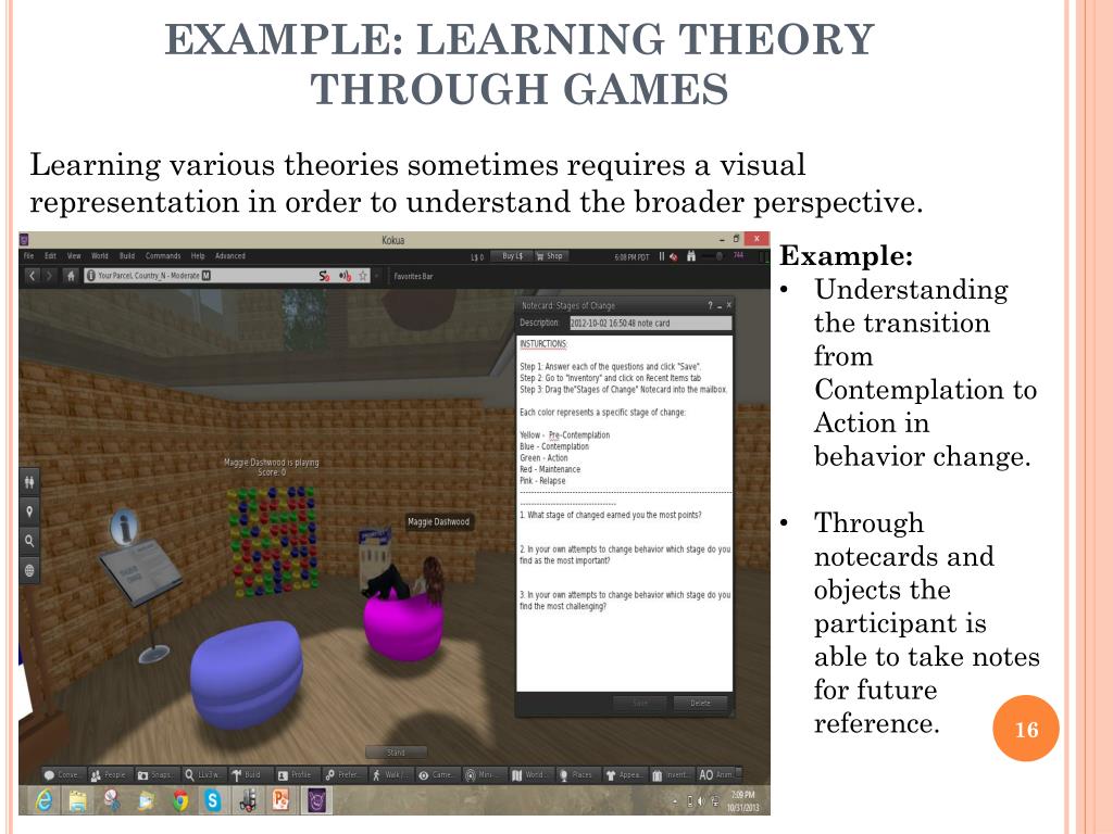 EXAMPLE: LEARNING THEORY THROUGH GAMES Learning various theories sometimes requires a visual representation in order to understand the broader perspective. • Example: • Understanding the transition from Contemplation to Action in behavior change. • Through notecards and objects the participant is able to take notes for future reference.