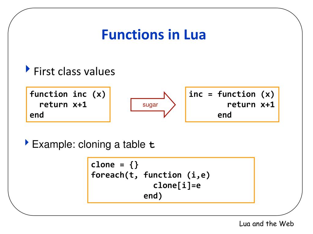 function inc (x) return x+1 end inc = function (x) return x+1 end sugar Functions in Lua • First class values • Example: cloning a table t clone = {} foreach(t, function (i,e) clone[i]=e end) Lua and the Web