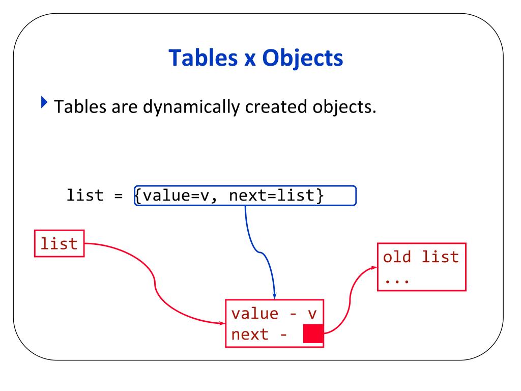 list = {value=v, next=list} value - v next - Tables x Objects • Tables are dynamically created objects. list old list ...