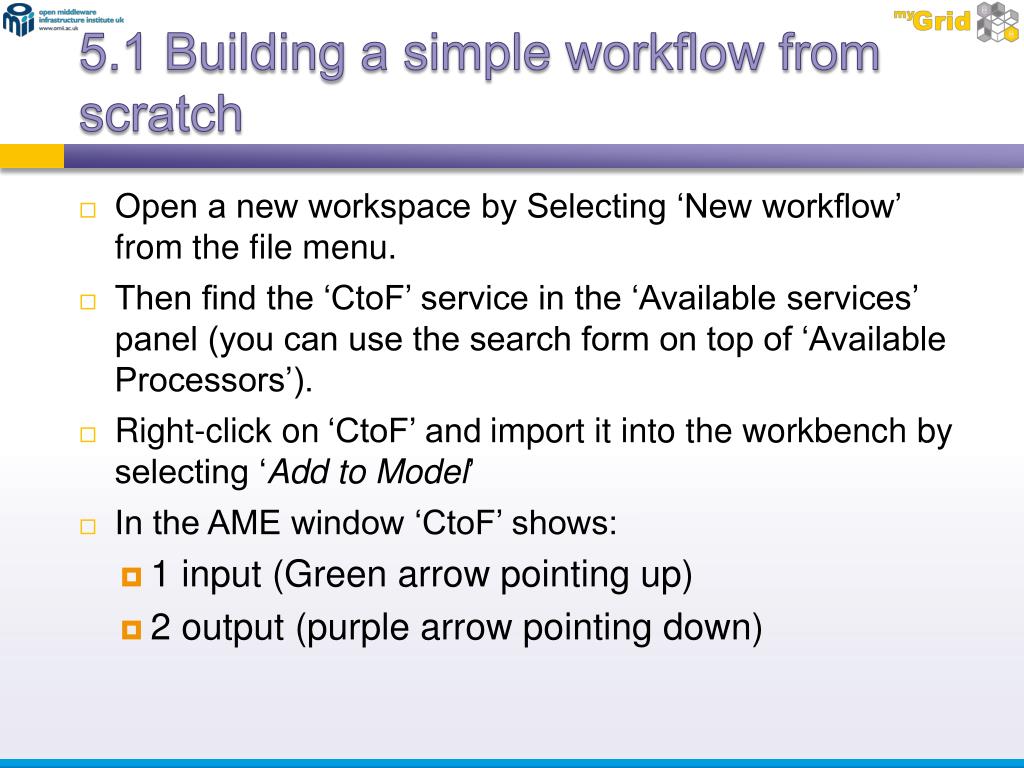 5.1 Building a simple workflow from scratch • Open a new workspace by Selecting ‘New workflow’ from the file menu. • Then find the ‘CtoF’ service in the ‘Available services’ panel (you can use the search form on top of ‘Available Processors’). • Right-click on‘CtoF’ andimport it into the workbench by selecting ‘Add to Model’ • In the AME window ‘CtoF’ shows: • 1 input (Green arrow pointing up) • 2 output (purple arrow pointing down)