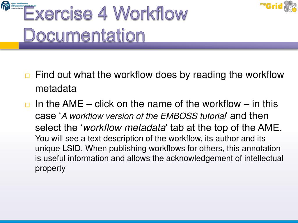Exercise 4 Workflow Documentation • Find out what the workflow does by reading the workflow metadata • In the AME – click on the name of the workflow – in this case ‘A workflow version of the EMBOSS tutorial’ and then select the ‘workflow metadata’ tab at the top of the AME. You will see a text description of the workflow, its author and its unique LSID. When publishing workflows for others, this annotation is useful information and allows the acknowledgement of intellectual property