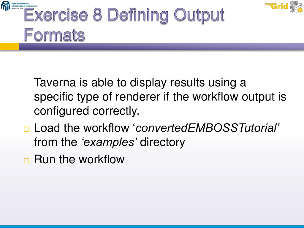 Exercise 8 Defining Output Formats Taverna is able to display results using a specific type of renderer if the workflow output is configured correctly. • Load the workflow ‘convertedEMBOSSTutorial’ from the ‘examples’ directory • Run the workflow