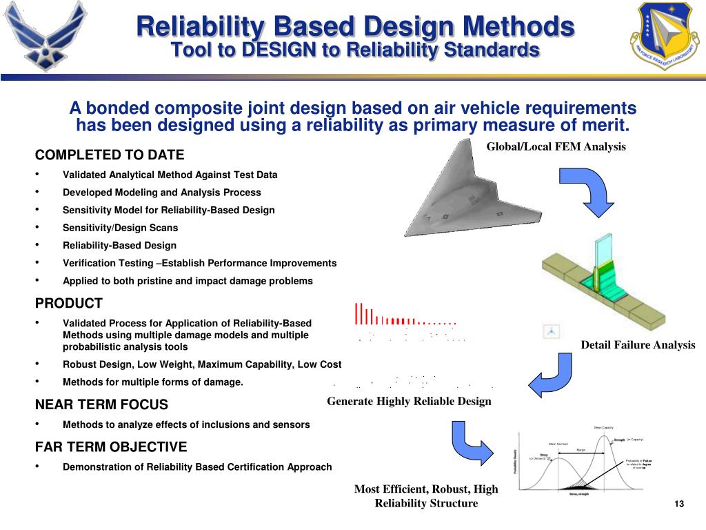 Reliability Based Design MethodsTool to DESIGN to Reliability Standards A bonded composite joint design based on air vehicle requirements has been designed using a reliability as primary measure of merit. COMPLETED TO DATE • Validated Analytical Method Against Test Data • Developed Modeling and Analysis Process • Sensitivity Model for Reliability-Based Design • Sensitivity/Design Scans • Reliability-Based Design • Verification Testing –Establish Performance Improvements • Applied to both pristine and impact damage problems PRODUCT • Validated Process for Application of Reliability-Based Methods using multiple damage models and multiple probabilistic analysis tools • Robust Design, Low Weight, Maximum Capability, Low Cost • Methods for multiple forms of damage. NEAR TERM FOCUS • Methods to analyze effects of inclusions and sensors FAR TERM OBJECTIVE • Demonstration of Reliability Based Certification Approach Global/Local FEM Analysis Detail Failure Analysis Generate Highly Reliable Design Most Efficient, Robust, High Reliability Structure
