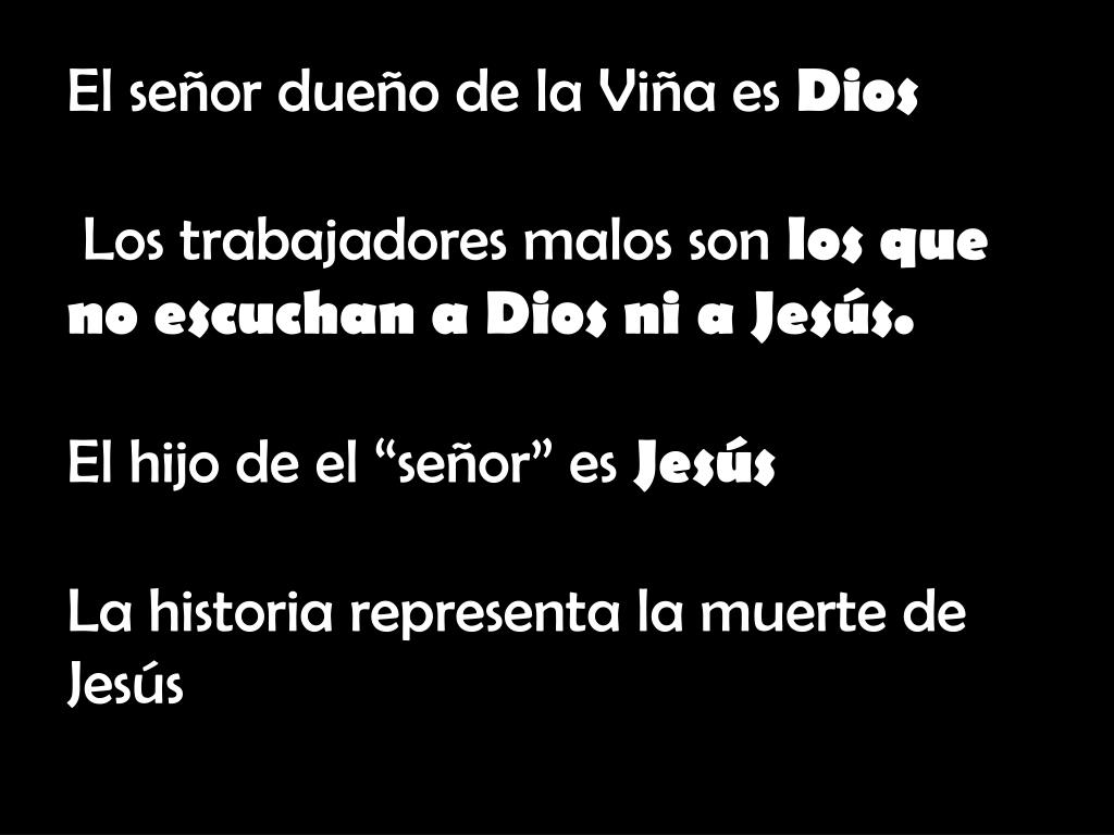 El señor dueño de la Viña es Dios Los trabajadores malos son los que no escuchan a Dios ni a Jesús. El hijo de el “señor” es Jesús La historia representa la muerte de Jesús