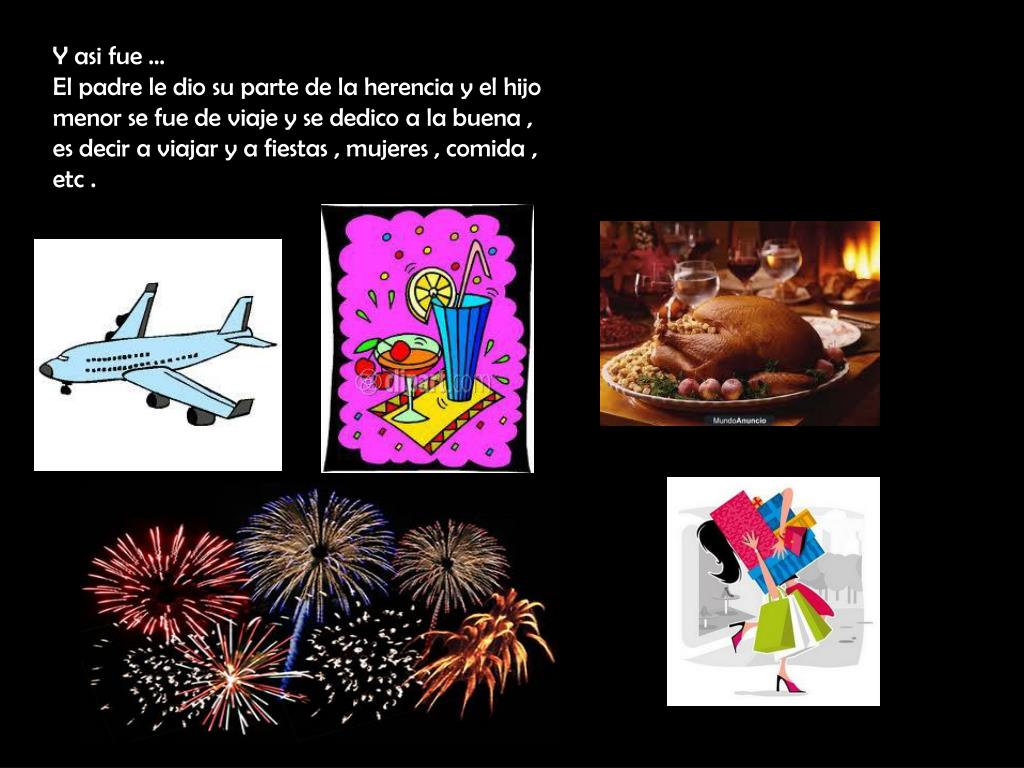Y asi fue … El padre le dio su parte de la herencia y el hijo menor se fue de viaje y se dedico a la buena , es decir a viajar y a fiestas , mujeres , comida , etc .