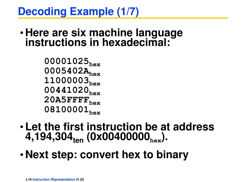 Decoding Example (1/7) • Here are six machine language instructions in hexadecimal: 00001025hex 0005402Ahex 11000003hex 00441020hex 20A5FFFFhex 08100001hex • Let the first instruction be at address 4,194,304ten (0x00400000hex). • Next step: convert hex to binary