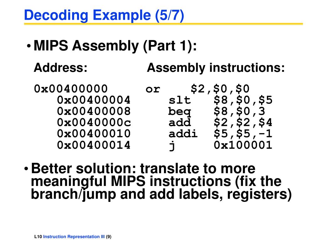 Decoding Example (5/7) • MIPS Assembly (Part 1): Address:Assembly instructions: 0x00400000 or $2,$0,$0 0x00400004 slt $8,$0,$5 0x00400008 beq $8,$0,3 0x0040000c add $2,$2,$4 0x00400010 addi $5,$5,-1 0x00400014 j 0x100001 • Better solution: translate to more meaningful MIPS instructions (fix the branch/jump and add labels, registers)