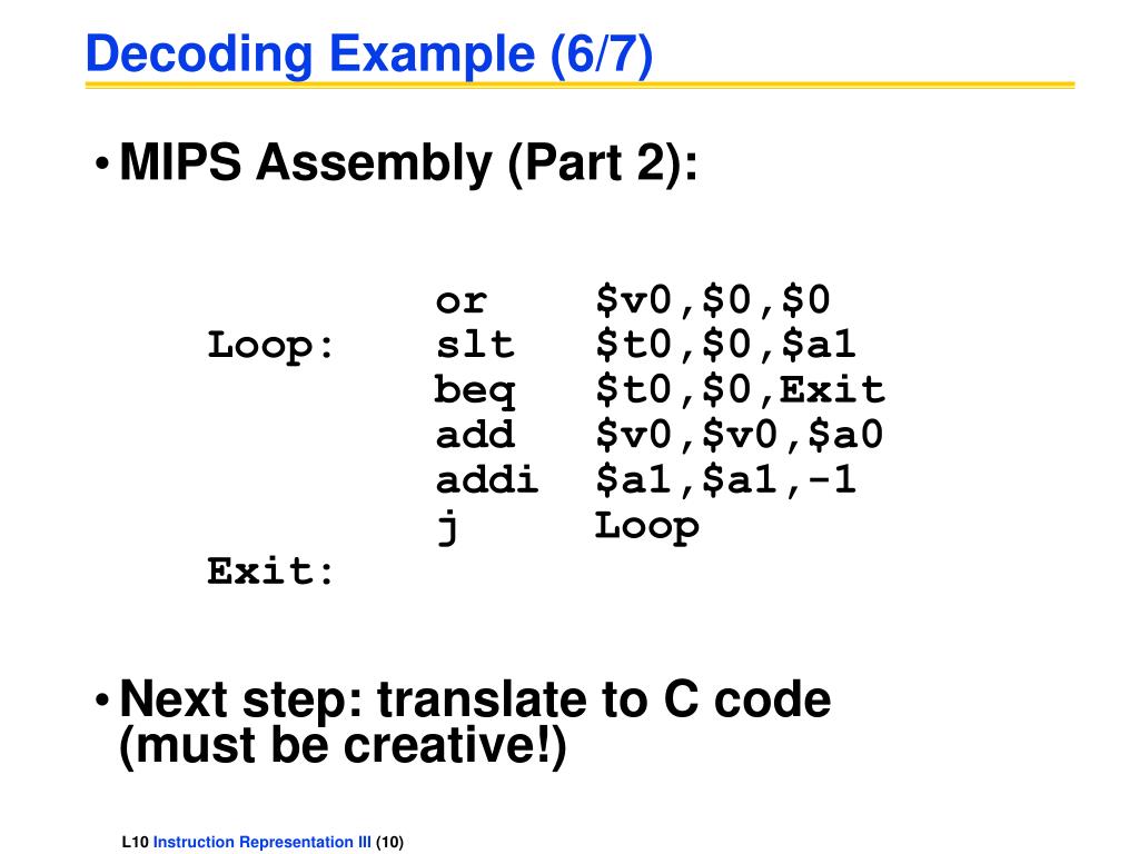 Decoding Example (6/7) • MIPS Assembly (Part 2): or $v0,$0,$0 Loop: slt $t0,$0,$a1 beq $t0,$0,Exit add $v0,$v0,$a0 addi $a1,$a1,-1 j Loop Exit: • Next step: translate to C code (must be creative!)