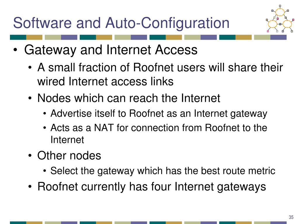 Software and Auto-Configuration • Gateway and Internet Access • A small fraction of Roofnet users will share their wired Internet access links • Nodes which can reach the Internet • Advertise itself to Roofnet as an Internet gateway • Acts as a NAT for connection from Roofnet to the Internet • Other nodes • Select the gateway which has the best route metric • Roofnet currently has four Internet gateways