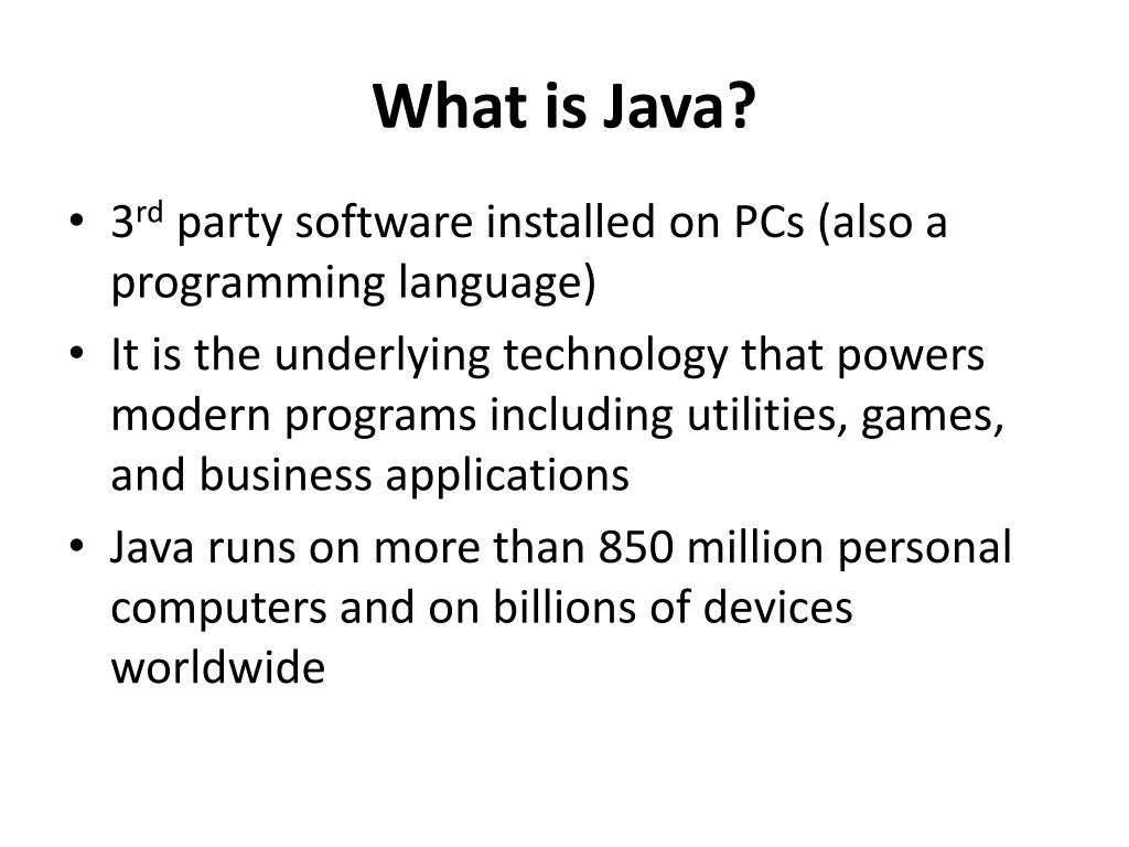 What is Java? • 3rd party software installed on PCs (also a programming language) • It is the underlying technology that powers modern programs including utilities, games, and business applications • Java runs on more than 850 million personal computers and on billions of devices worldwide