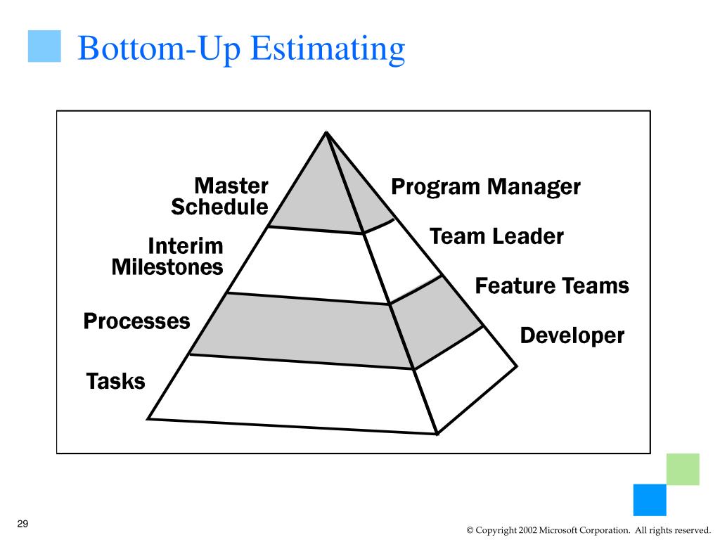 Resources Schedule Features Project Trade-off Matrix Fixed Chosen Adjustable Resources Microsoft’sTypicalApproach Schedule Feature Set Fill in the blanks Given fixed ___________, we will choose a ___________, and adjust _________ as necessary.