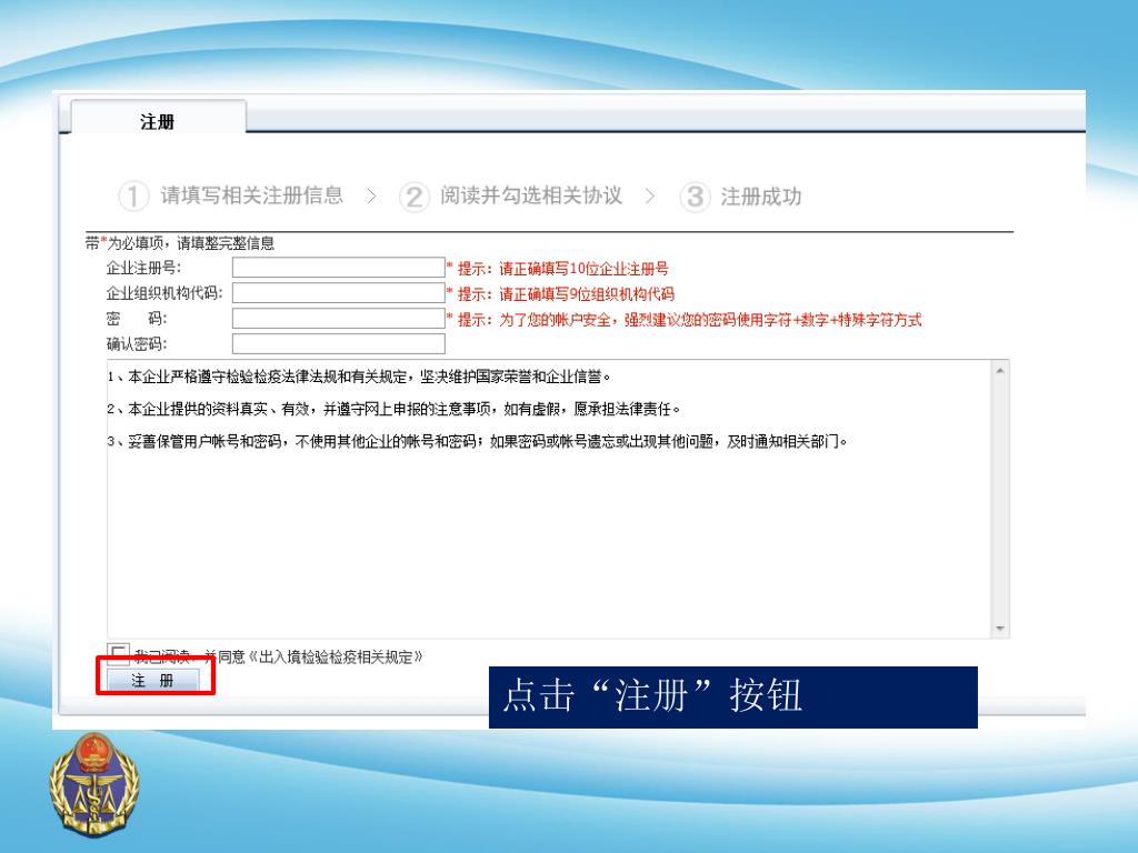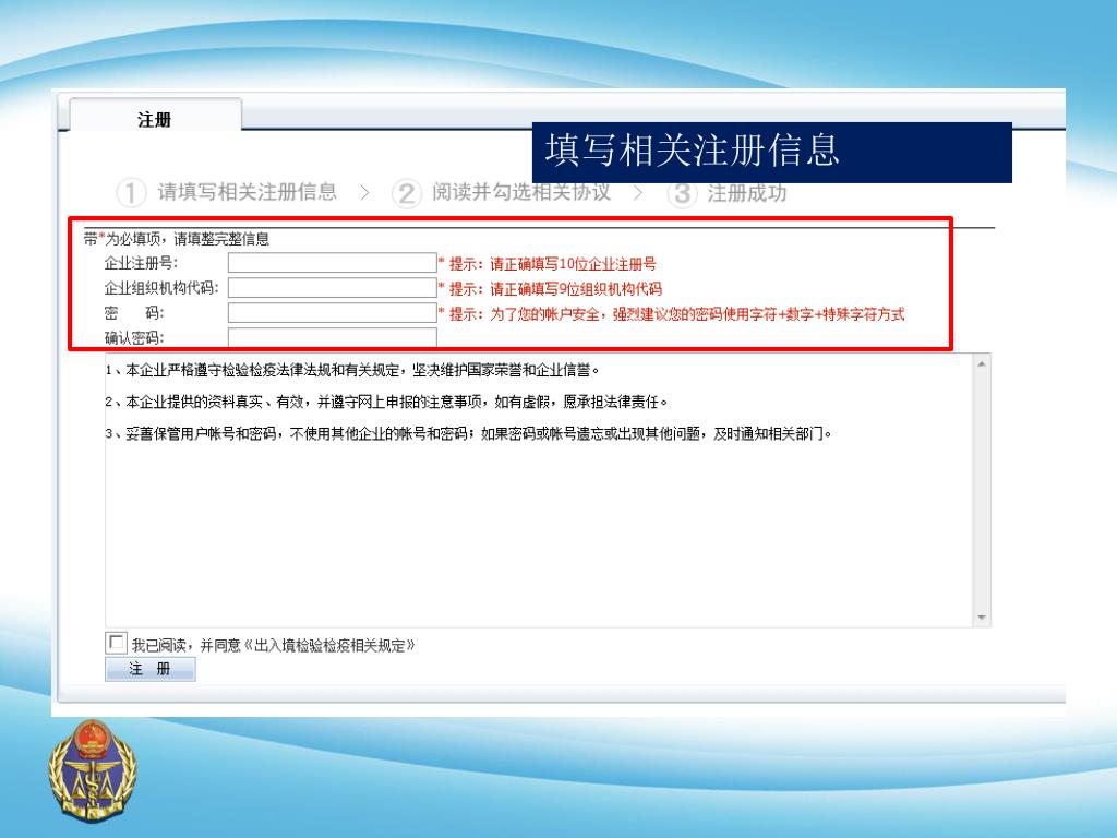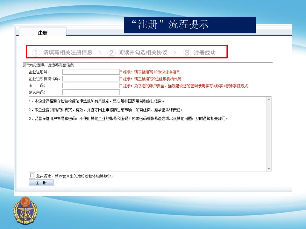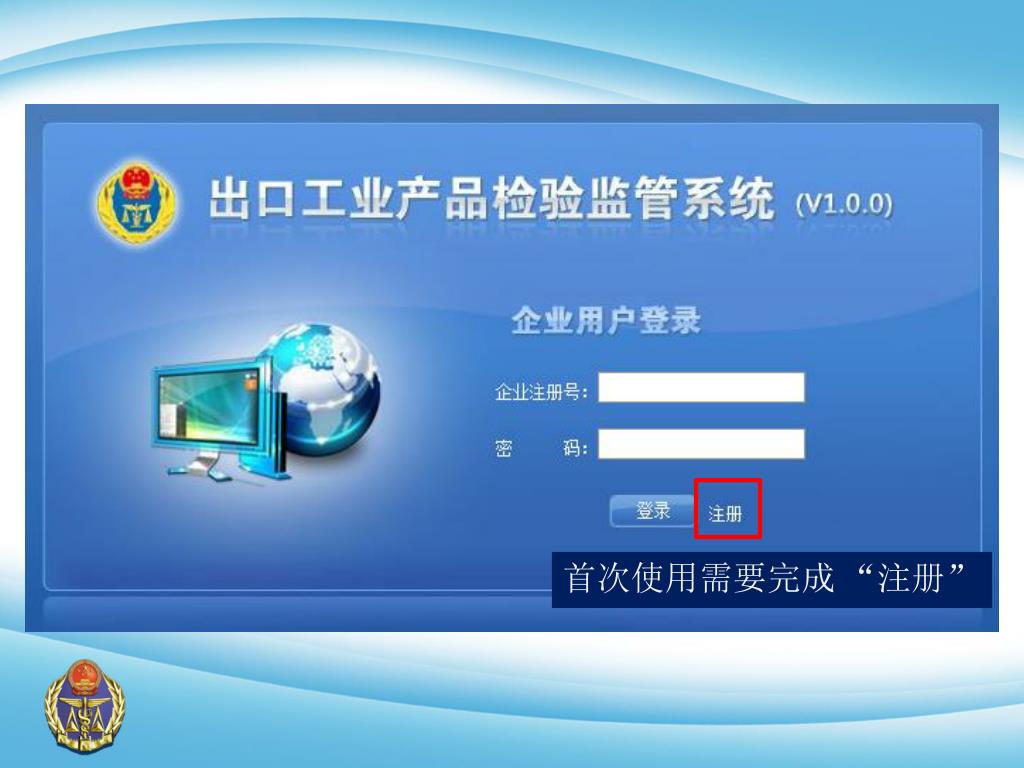 出口工业产品检验监管系统. 企业端使用说明. 系统简介. 系统总体框架. 1. 以产品为中心的风险信息收集 、分析、处置系统 2. 对企业质量安全保证能力进行整体评价 3. 为 具体检验监管行为 提供 行 动态提示、对实施过程及结果进行 督查. 系统的总体目标为:. 1. 利用互联网的优势,通过软件系统有效的实现以产品为中心的风险信 息收集机制。 2. 对企业质量安全保证能力进行整体评价 3. 对具体检验监管行为进行快速、动态督查,提高检验监管效率。. 如何登陆企业端?.