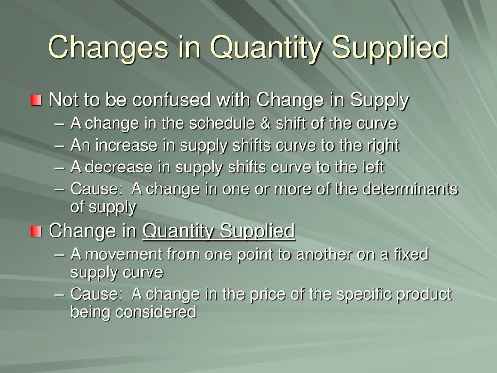 Changes in Quantity Supplied • Not to be confused with Change in Supply • A change in the schedule & shift of the curve • An increase in supply shifts curve to the right • A decrease in supply shifts curve to the left • Cause: A change in one or more of the determinants of supply • Change in Quantity Supplied • A movement from one point to another on a fixed supply curve • Cause: A change in the price of the specific product being considered