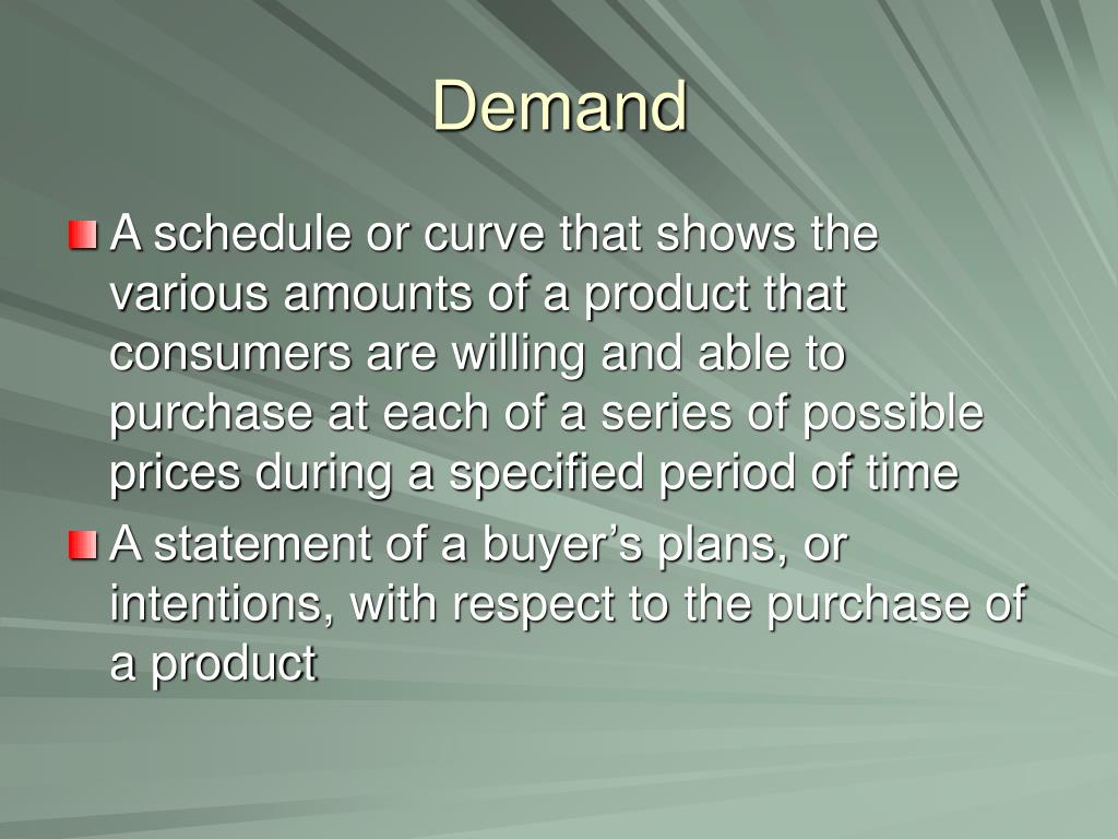 Demand • A schedule or curve that shows the various amounts of a product that consumers are willing and able to purchase at each of a series of possible prices during a specified period of time • A statement of a buyer’s plans, or intentions, with respect to the purchase of a product