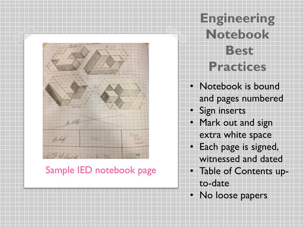 Engineering Notebook Best Practices • Notebook is bound and pages numbered • Sign inserts • Mark out and sign extra white space • Each page is signed, witnessed and dated • Table of Contents up-to-date • No loose papers Sample IED notebook page