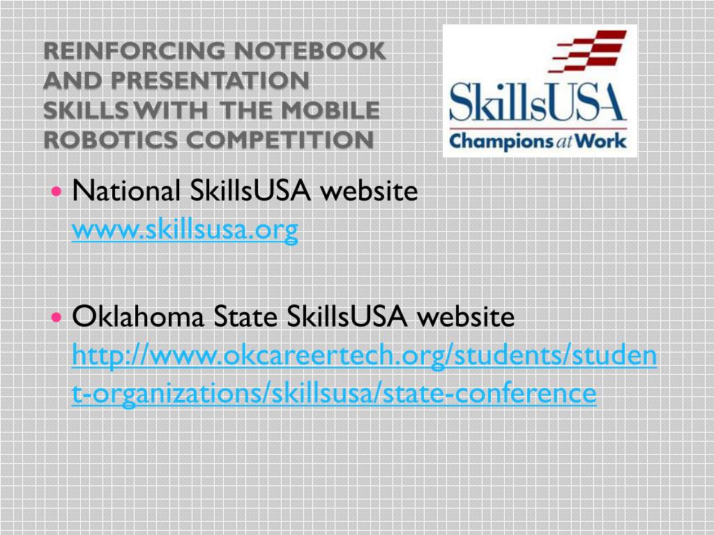Reinforcing notebook and presentation skills with The Mobile robotics Competition • National SkillsUSA website www.skillsusa.org • Oklahoma State SkillsUSA website http://www.okcareertech.org/students/student-organizations/skillsusa/state-conference