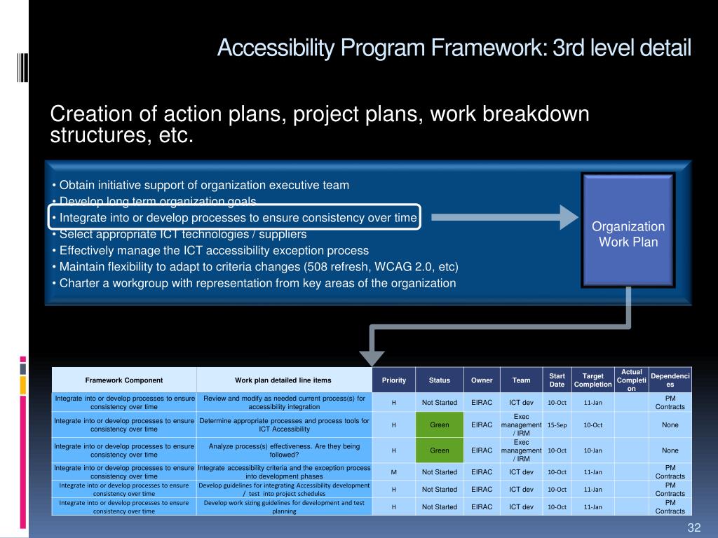 Accessibility Program Framework: 3rd level detail Creation of action plans, project plans, work breakdown structures, etc. • Obtain initiative support of organization executive team • Develop long term organization goals • Integrate into or develop processes to ensure consistency over time • Select appropriate ICT technologies / suppliers • Effectively manage the ICT accessibility exception process • Maintain flexibility to adapt to criteria changes (508 refresh, WCAG 2.0, etc) • Charter a workgroup with representation from key areas of the organization Organization Work Plan