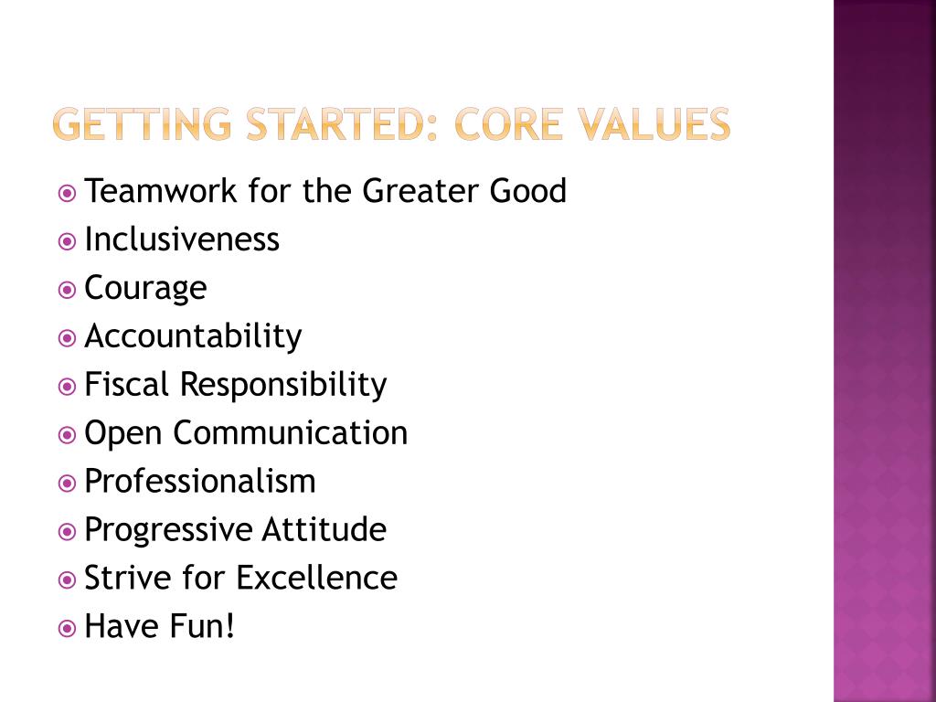 Getting started: core values • Teamwork for the Greater Good • Inclusiveness • Courage • Accountability • Fiscal Responsibility • Open Communication • Professionalism • Progressive Attitude • Strive for Excellence • Have Fun!
