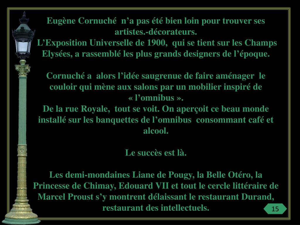Eugène Cornuché n’a pas été bien loin pour trouver ses artistes.-décorateurs. L’Exposition Universelle de 1900, qui se tient sur les Champs Elysées, a rassemblé les plus grands designers de l’époque. Cornuché a alors l’idée saugrenue de faire aménager le couloir qui mène aux salons par un mobilier inspiré de « l’omnibus ». De la rue Royale, tout se voit. On aperçoit ce beau monde installé sur les banquettes de l’omnibus consommant café et alcool. Le succès est là. Les demi-mondaines Liane de Pougy, la Belle Otéro, la Princesse de Chimay, Edouard VII et tout le cercle littéraire de Marcel Proust s’y montrent délaissant le restaurant Durand, restaurant des intellectuels. 15