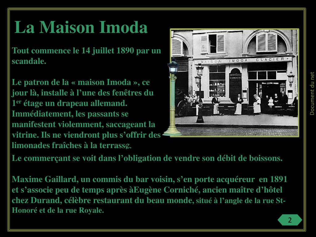 La Maison Imoda Tout commence le 14 juillet 1890 par un scandale. Le patron de la « maison Imoda », ce jour là, installe à l’une des fenêtres du 1er étage un drapeau allemand. Immédiatement, les passants se manifestent violemment, saccageant la vitrine. Ils ne viendront plus s’offrir des limonades fraîches à la terrasse. Document du net Le commerçant se voit dans l’obligation de vendre son débit de boissons. Maxime Gaillard, un commis du bar voisin, s’en porte acquéreur en 1891 et s’associe peu de temps après àEugène Corniché, ancien maître d’hôtel chez Durand, célèbre restaurant du beau monde, situé à l’angle de la rue St-Honoré et de la rue Royale. 2