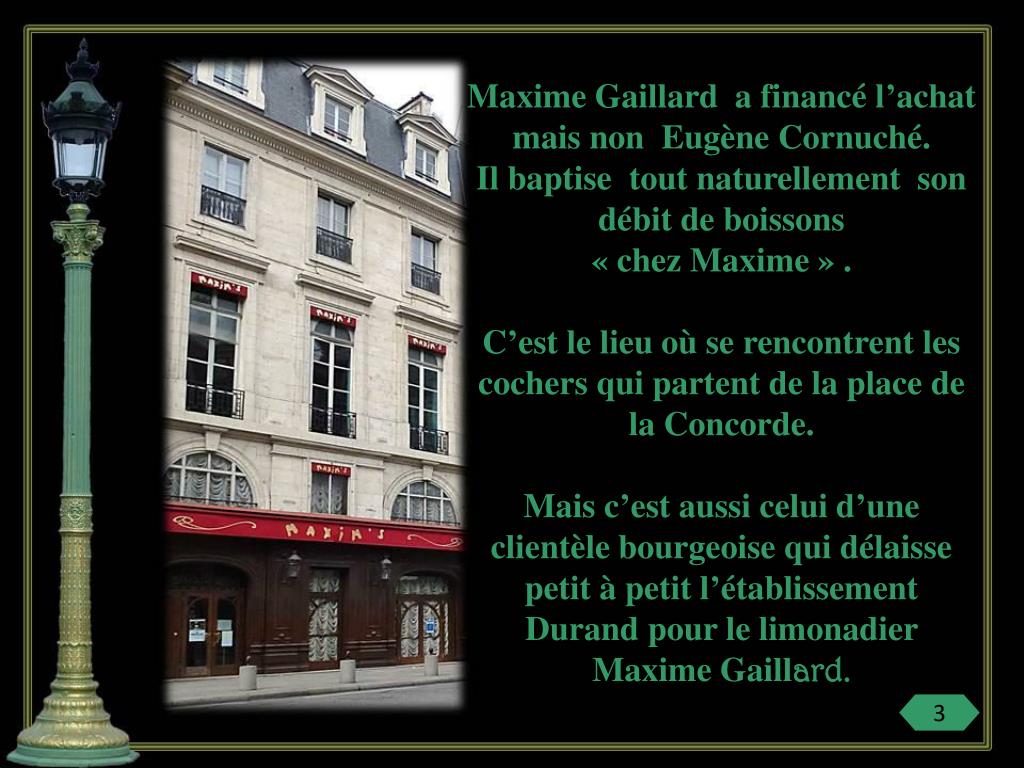 Maxime Gaillard a financé l’achat mais non Eugène Cornuché. Il baptise tout naturellement son débit de boissons « chez Maxime » . C’est le lieu où se rencontrent les cochers qui partent de la place de la Concorde. Mais c’est aussi celui d’une clientèle bourgeoise qui délaisse petit à petit l’établissement Durand pour le limonadier Maxime Gaillard. « 3