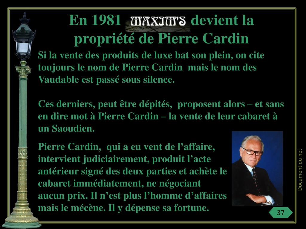 de nos jours En 1977 C’est alors que Pierre Cardin, couturier de renom, homme d’affaires avisé, et amoureux de la Belle Epoque, propose à la famille Vaudable de faire de une griffe prestigieuse pour tous les produits alimentaires de luxe, pour les fleurs, la vaisselle, les objets de décoration, comme il l’a fait pour sa propre marque. Les Vaudable, enthousiasmés par ses idées, proposent une association en 1977 avec option prioritaire pour l’achat du cabaret-restaurant. On trouva alors du foie gras, du champagne, des draps , de la vaisselle…..Maxim’s dans les magasins et hôtels de luxe à travers le monde. 36